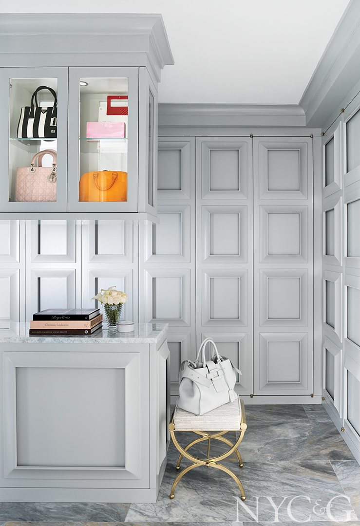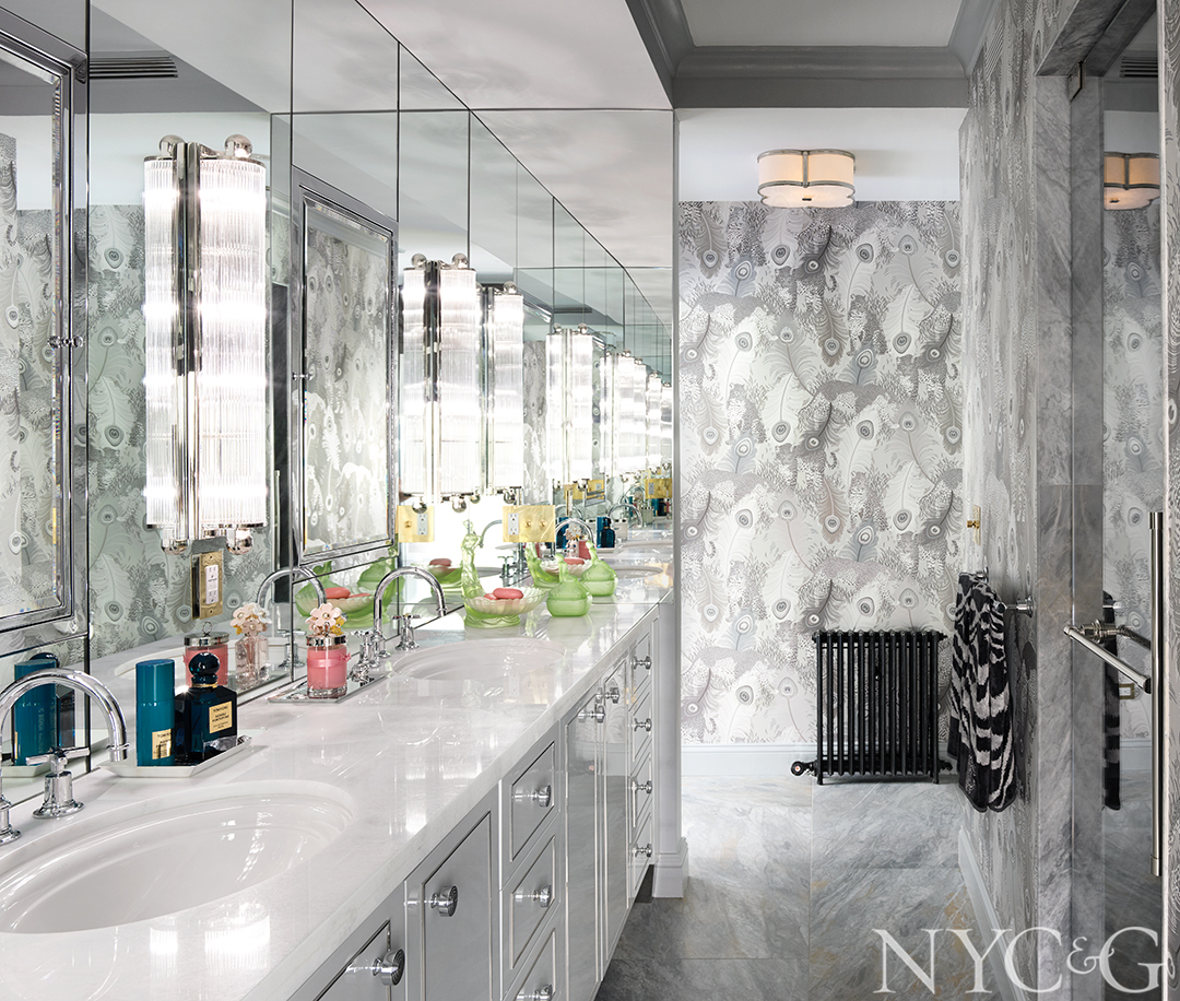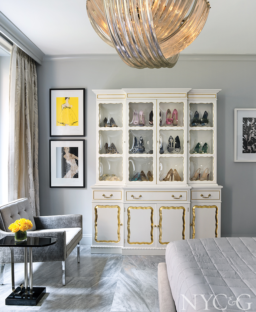 The highly collaborative clients also allowed the decorators “to do a lot of things, like use tons of colors,” Marra says, although the kitchen is intentionally appointed in tuxedo-sharp, monochromatic black and white, its reflective surfaces intended to maximize light in the sub-grade space. Upstairs, the emerald-green library includes a large bar with wood fretwork painted in 14k gold. The guest room’s palette was inspired by pagoda-shaped bright orange silk lampshades that the duo found at the Midtown shop Illumé. The pink of the dining room is the most telling homage to Draper, with deep banquettes covered in blush Naugahyde (the same pink appears in the elevator). Decked out in soothing gray, the bedroom in the master suite features an antique Dorothy Draper buffet, repurposed as a repository for the lady of the house’s shoes.