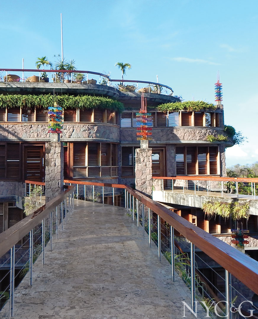 Jade is known as the “stone of heaven,” and therefore a fitting moniker for a resort seemingly built by miracle, so steep is the site it sits on. Its 29 suites, called “sanctuaries,” are essentially stacked in rows on top of one another, so each can take in the full-on view of the glorious Pitons. Even though it is now 10 years old, Jade Mountain is still a sight to behold, its captivating po-mo architecture an agglomeration of concrete, stone, rebar, and colored glass, with seductive catwalks connecting suites to the resort’s common areas, restaurants, and paths down to the beach. Because the elevation is so precarious, little excavation was done, and most everything was built by hand, using materials native to St. Lucia, although some of the wood in the suites is from Guyana, and the coral pavers on the walkways are from the Dominican Republic. (St. Lucia’s dark volcanic soil is too hot underfoot.) As for the whimsical recycled-glass accents, by artisan David Knox, they seem to change hues constantly as the sunlight plays off them all day long.