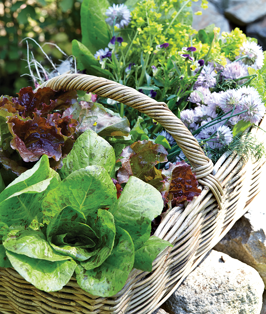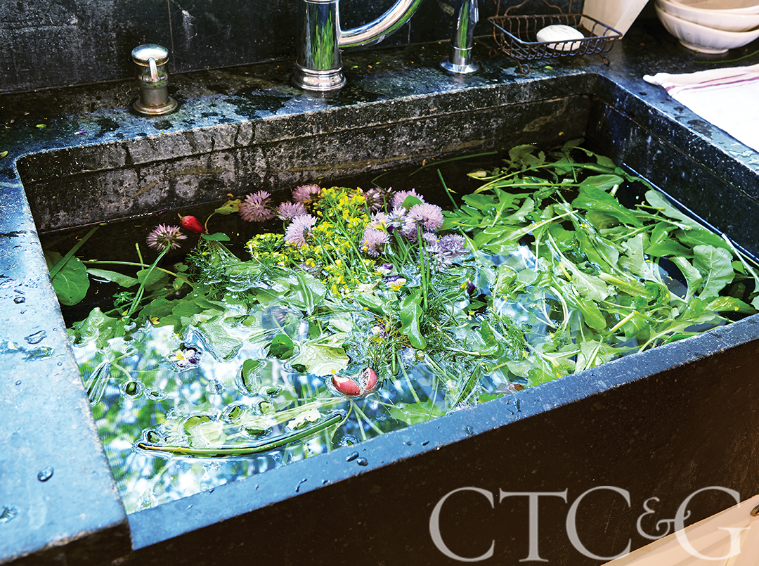 Freshly picked greens get a bath in the kitchen’s farm sink.