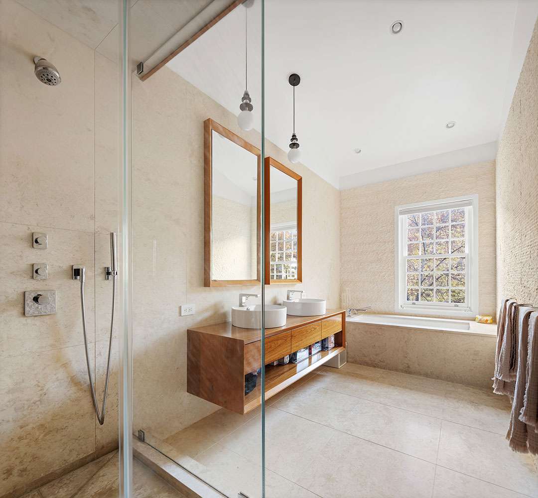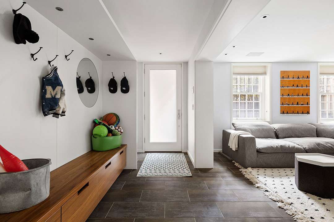 Across the main floor, you’ll find a living room, dining room, kitchen, and access to the private backyard (a true NYC luxury). The two upper floors feature four bedrooms, with the fifth in the basement. The lower level also includes a home gym and den.