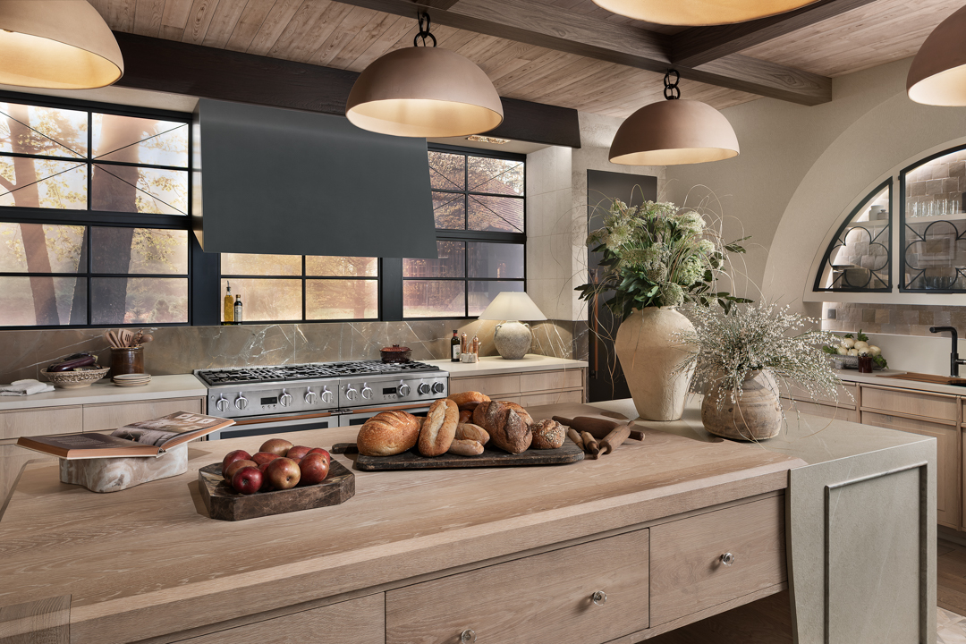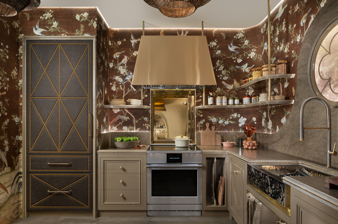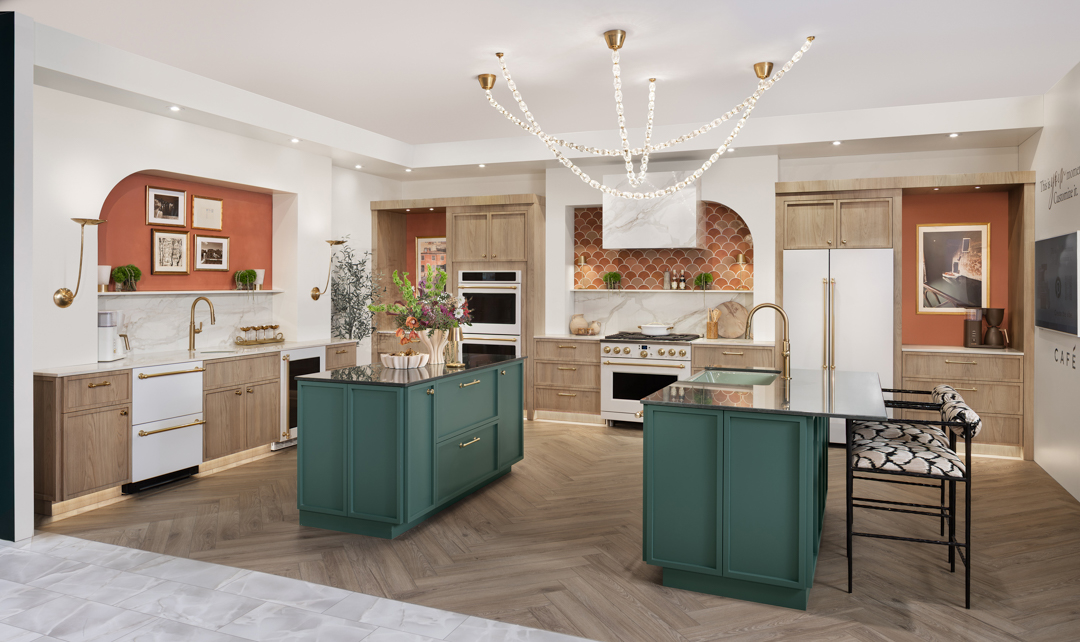 The final stop on the tour was Café Appliances, where designers explored the installation “This is Your Moment. Customize It.” The space featured three distinct kitchen vignettes: Postcards From Venice Kitchen, with a 36-inch stone-clad custom hood and a counter-depth refrigerator with dual-dispense AutoFill pitcher; Greenhouse Garden Party Kitchen, featuring a moody, botanical palette with a panel-ready dishwasher and dramatic 48-inch tapered hood; and Cashmere Breakfast Club Kitchen, offering a softer, California-modern sensibility paired with stainless steel appliances like the Smart Built-In Convection Wall Oven. “The booth this year celebrated personal expression,” DJ Carey says. “The three kitchen vignettes in the booth will inspire you with layered finishes, thoughtfully selected hardware, and purposeful appliance choices.”