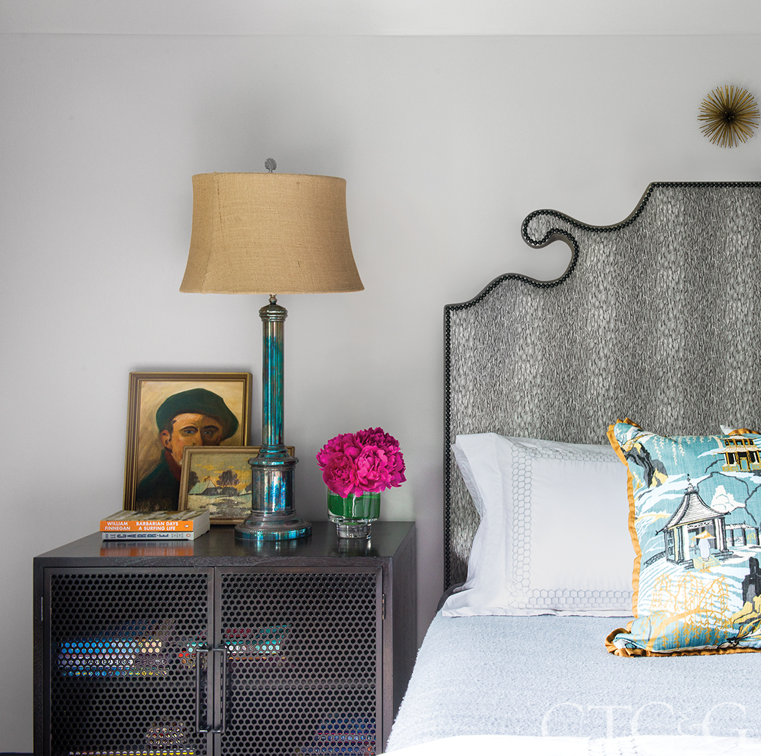 The headboard in the master bedroom are crafted from the same Kravet textile from the Jeffrey Alan Marks collection. Antique lamps top night stands through Oly Studio.