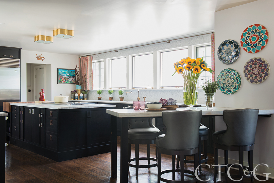 The footprint of the house stayed intact, except for the kitchen, which was bumped out four feet. Cabinetry is by Christopher Peacock. The bar stools are Wesley Hall through Schwartz Design Showroom, and the flush mount fixtures are from Circa Lighting.
