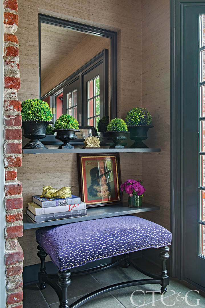 In a sitting area off the kitchen, a Phillip Jeffries faux fur covers the walls.