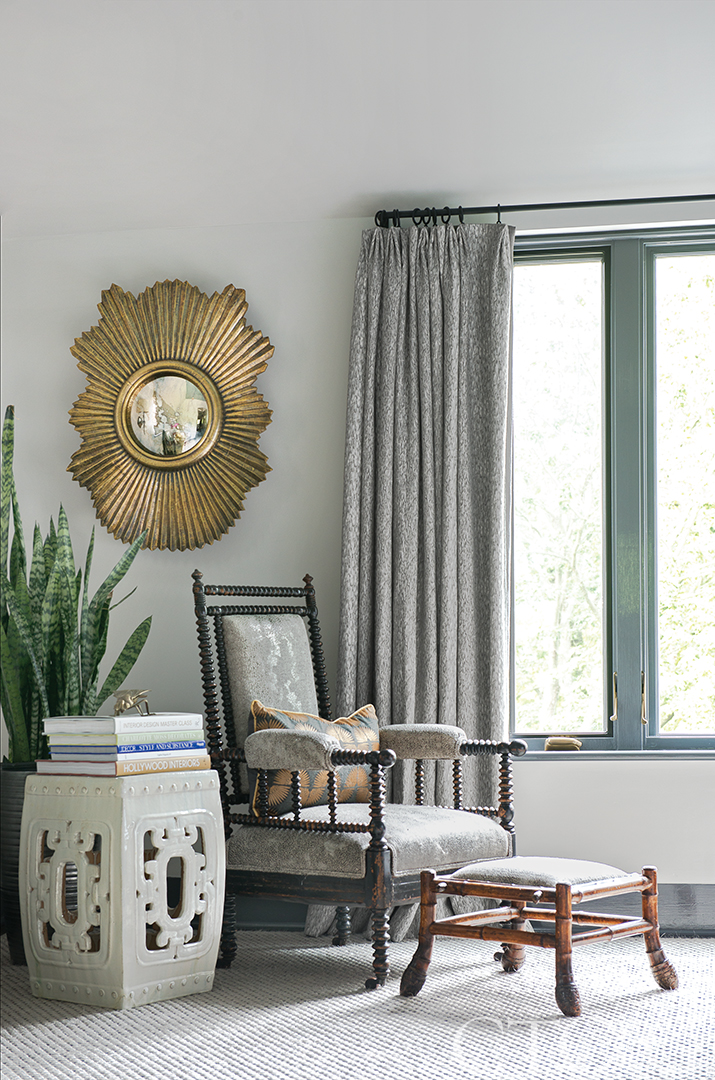 An antique chair from Privet House in a Kravet Groundworks fabric sits under a gold mirror from Arteriors.