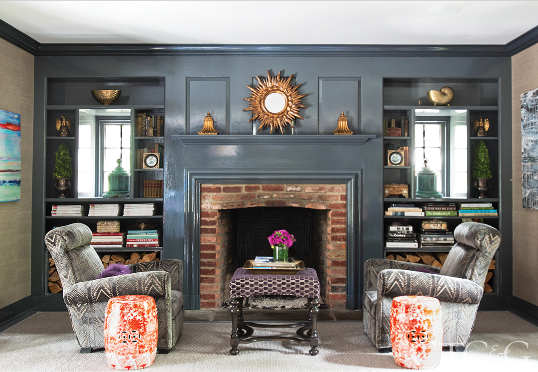 By the fireplace, armchairs from Privet House in an Osborne & Little fabric flank a Formations ottoman also through Privet House.