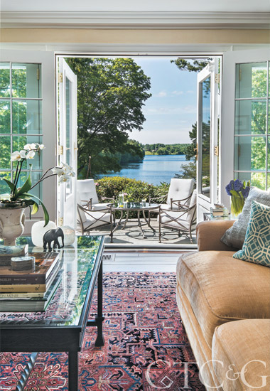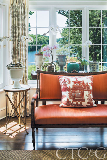 In the family room the sofa and chairs are covered in Kravet fabrics. The Tibetan rug is from Kaoud Carpets & Rugs; antique bench is from Antique & Artisan Center.