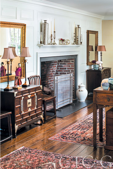 Furnished with antique rugs, chests and porcelains gathered from abroad, the room’s original paneling lends a colonial vibe.