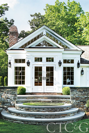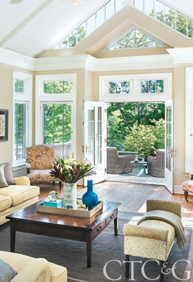 Fashioned after an English conservatory, the mostly glass family room embraces outdoor living.