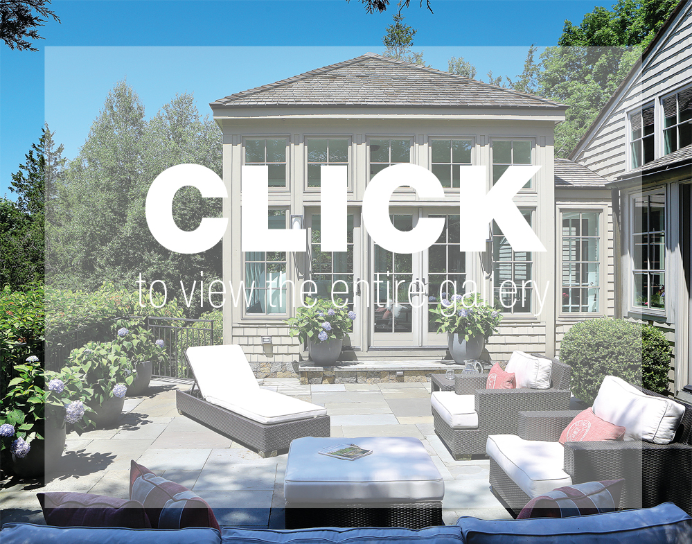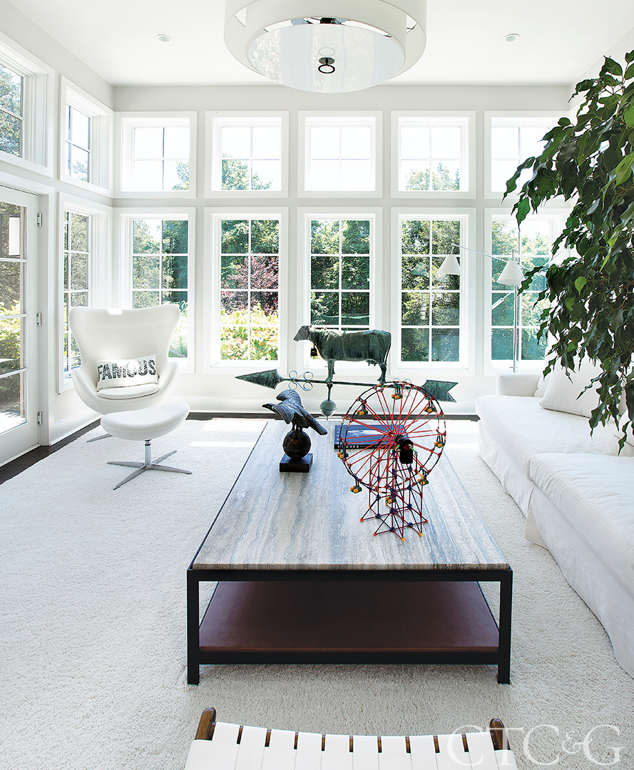 Next, a brick wall separating the kitchen and living room made way for a less imposing painted version with an additional opening on one side and a new fieldstone hearth. “The changes were done one section at a time, so it has a very organic feel,” says Latham, noting the garage, guest room and den addition ensued with the creation of a sunroom off the living room completing the multi-stage project. “My job was to make the rooms consistent with the contemporary farmhouse theme while establishing a monochromatic backdrop for the landscape and the owner’s artwork.”