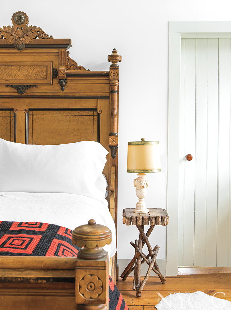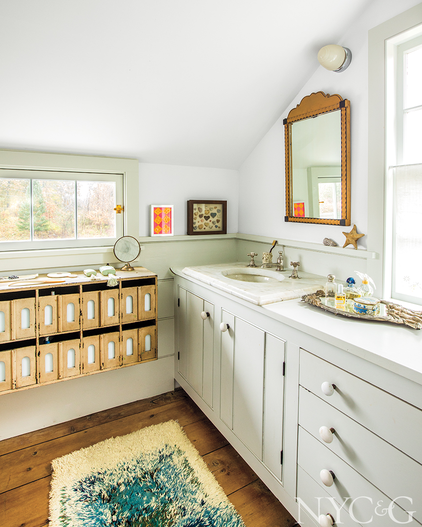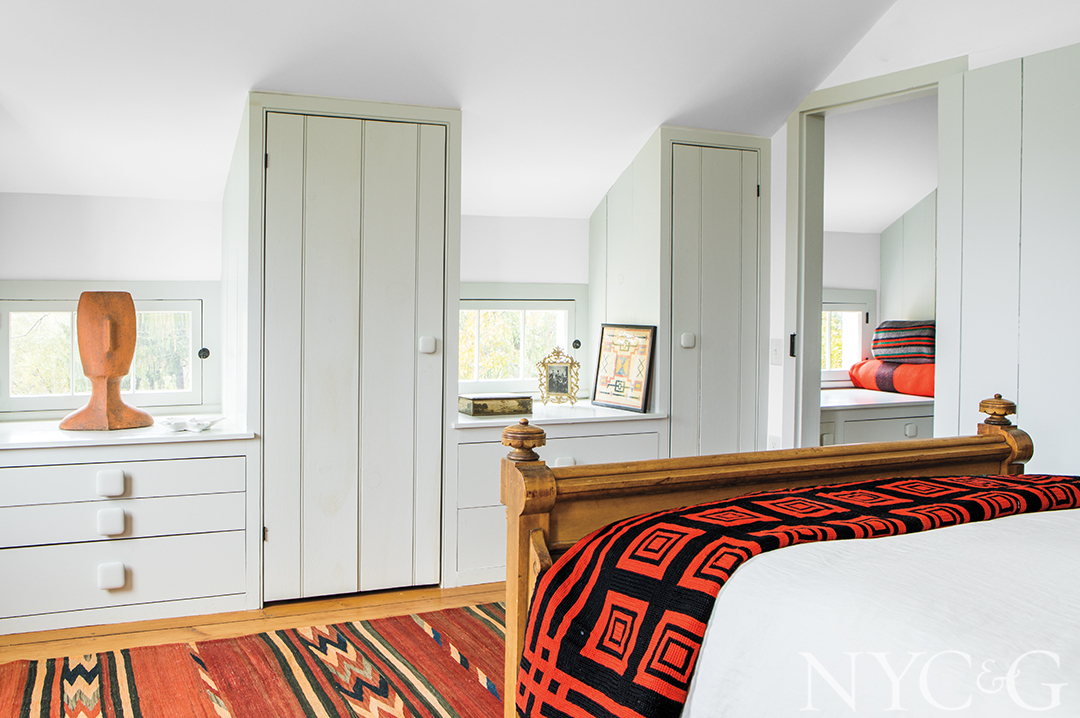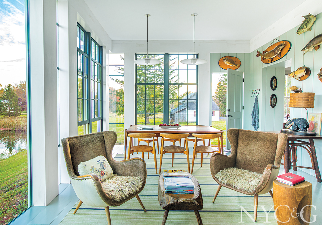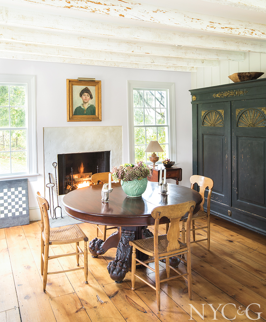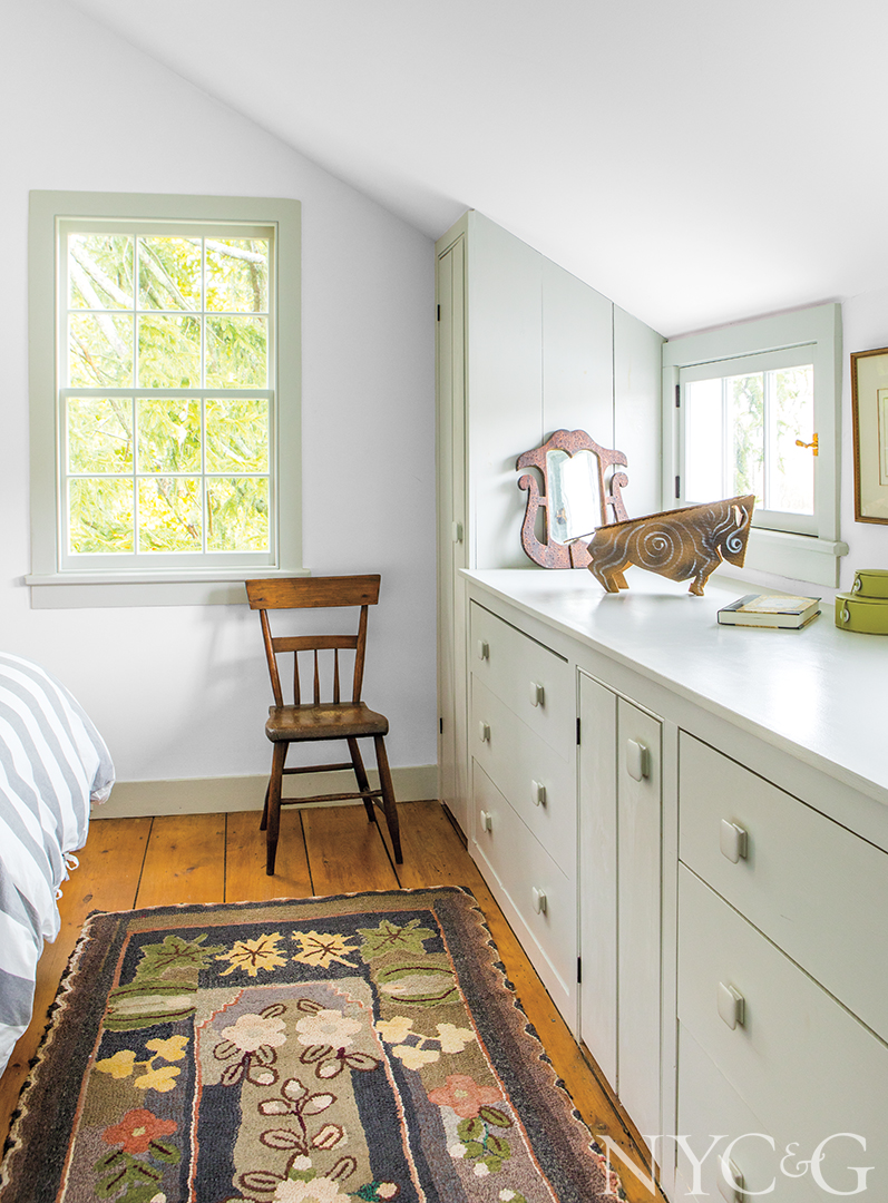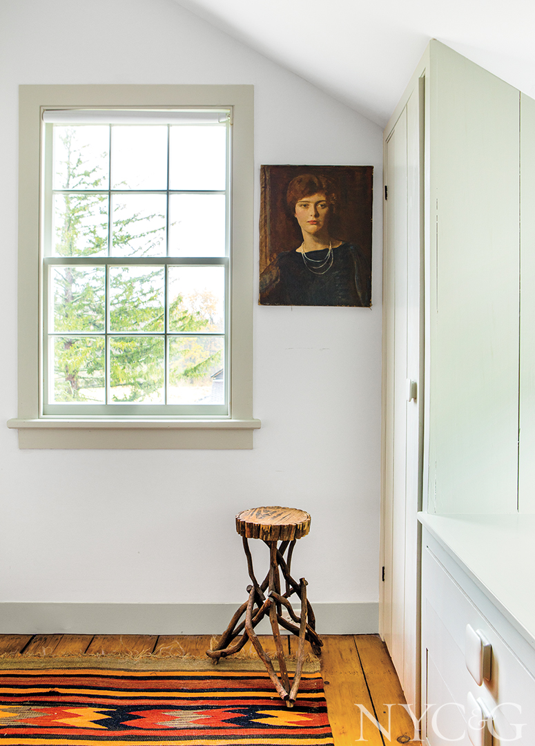 Likewise, the Germantown farmhouse is firmly rooted to its pastoral surroundings, flanked by two ponds on a former orchard once owned by the Rockefeller family. Chip, who likes to garden, randomly planted oak, tupelo, cypress, and white pine trees to amplify the woodland aesthetics, and he’s also cultivating a bird sanctuary: Unmown swaths of grass now provide habitat for blue jays, mourning doves, red-tailed hawks, great blue herons, and pileated woodpeckers. “The best season here is undoubtedly summer, particularly when it rains and gets so green,” Barbara reflects. “But it’s also amazingly fragrant in the spring and so romantic when it snows. And when the leaves start to turn in the fall . . . Well, I can’t even begin to describe the colors.”