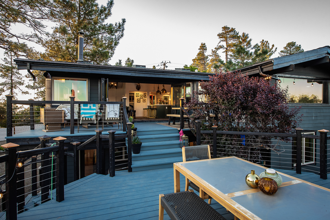 Away from the glitz and glamour of Hollywood, the property is nestled on 0.45 acres among nature with just three bedrooms and three bathrooms. The primary suite boasts a claw-foot soaking tub with panoramic views. The main living area with vaulted ceilings includes a brand-new chef’s kitchen, red hanging fireplace, and plenty of gathering areas. It opens directly up to multiple levels of decks, all with stunning mountain views. The lower level of the home is an entertainment zone, with billiards, pub-style bar, and a secondary kitchen.