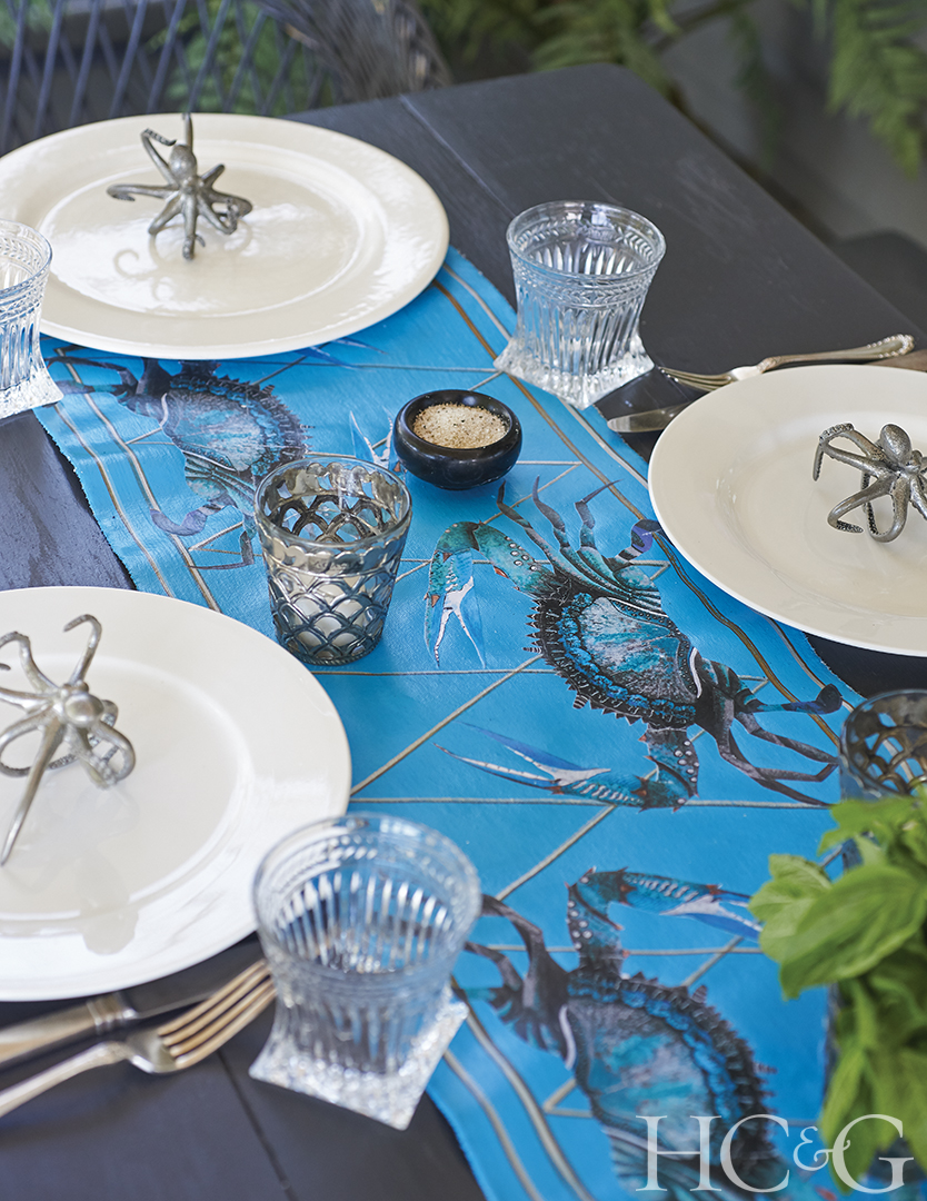 Susannah Reid’s East Hampton studio is a wonderland of marine life and natural curiosities. Nearly every surface is covered with pages of ocean and animal imagery culled from books, which she uses to make whimsical decoupage and hand-painted table runners, floorcloths, and wallpaper borders. Reid’s veneration for all things aquatic stems from her childhood, when she would assist her father, an Emmy-winning underwater filmmaker, on diving shoots in far-flung locales such as Tahiti and the Gulf of Aqaba. “That world was a constant part of my life,” explains the New Jersey native, who went on to study fabric design at the Art Institute of Chicago. “It’s where my creative vision comes from.”