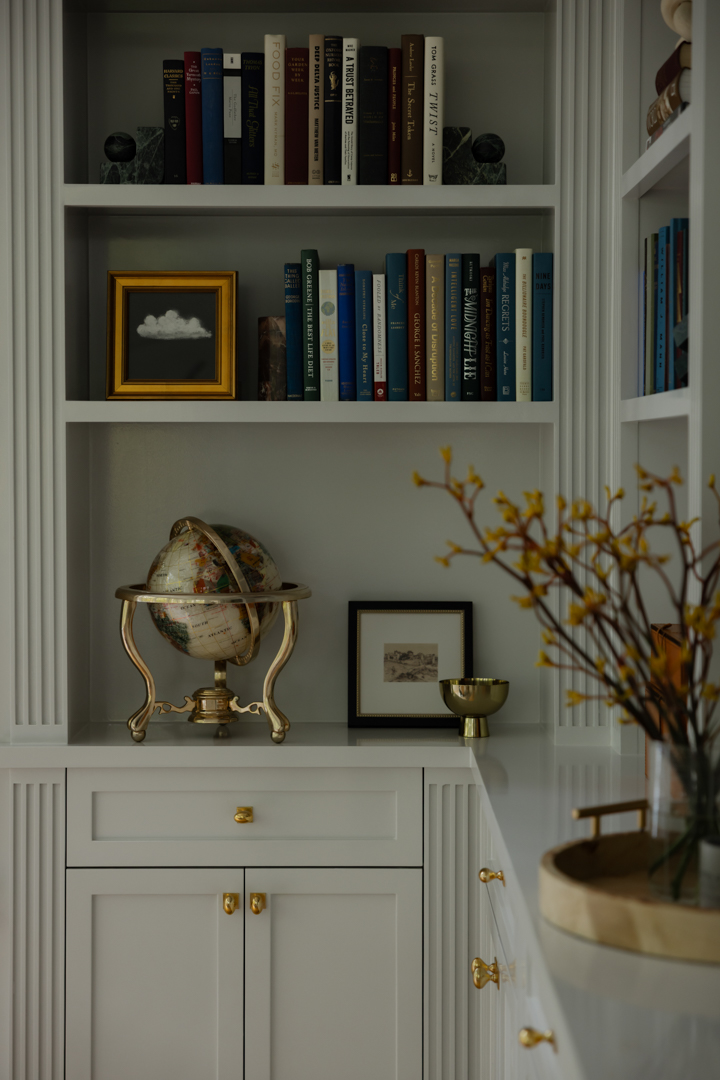 The millwork was designed to balance traditional architecture with contemporary living. In the dining room, we introduced arches within the glass cabinetry as a nod to classic detailing, while keeping the cabinet doors slab to maintain a modern edge. That juxtaposition creates depth and interest. The den millwork was designed around the client’s love of coffee table books, making it feel personal and curated. The office leans more traditional in its detailing to feel grounded, while the bathrooms are intentionally clean and contemporary.