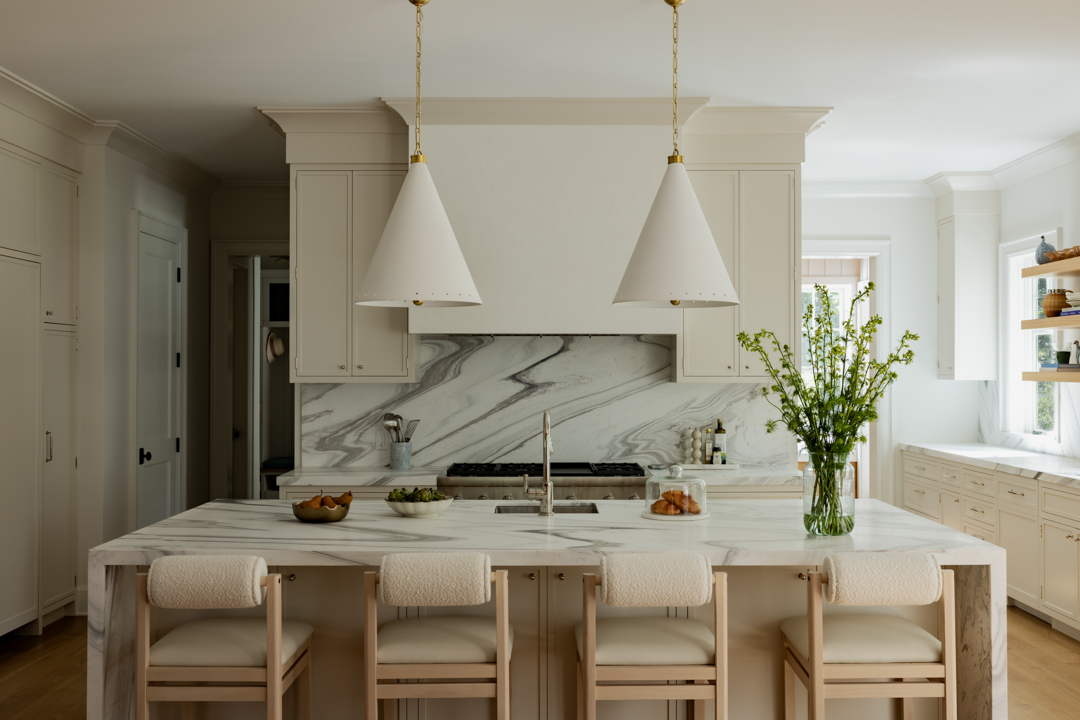 The island stone is Helena from Brazil, sourced through BAS Stone. Its movement gives the room energy without overwhelming it. The pendants are from Hudson Valley Lighting Co. They are sculptural enough to anchor the island, while still feeling timeless.