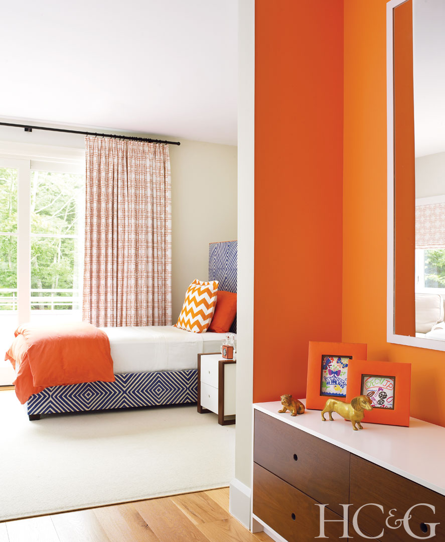 A niche in the boys’ bedroom is painted Benjamin Moore’s Carrot Stick. The bed frame is covered in a graphic print from Quadrille; the area rug is from Holland & Sherry.
