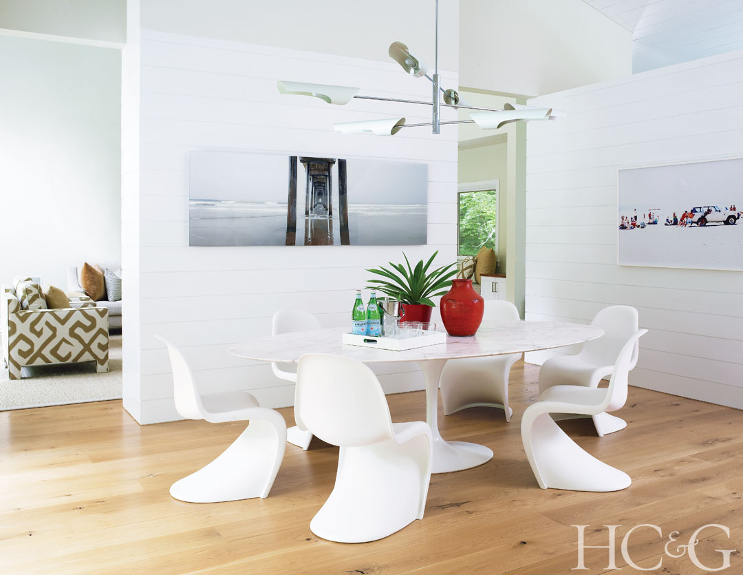 A Saarinen table with a Calacatta marble top and a suite of Panton chairs sit below a David Weeks chandelier in the dining area. The photographs are by Peter Lik and Geoff Reinhard (left to right).