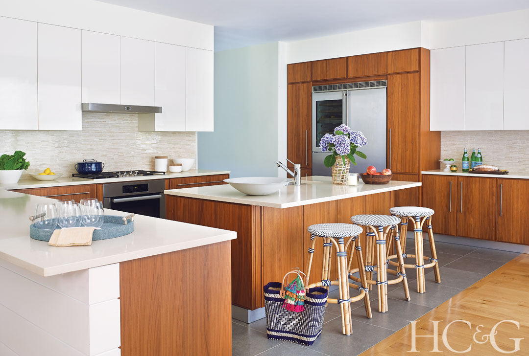 The kitchen features a mix of walnut and lacquer cabinetry by Scavolini; the countertop is from Silestone and the Riviera stools are from Serena & Lily.