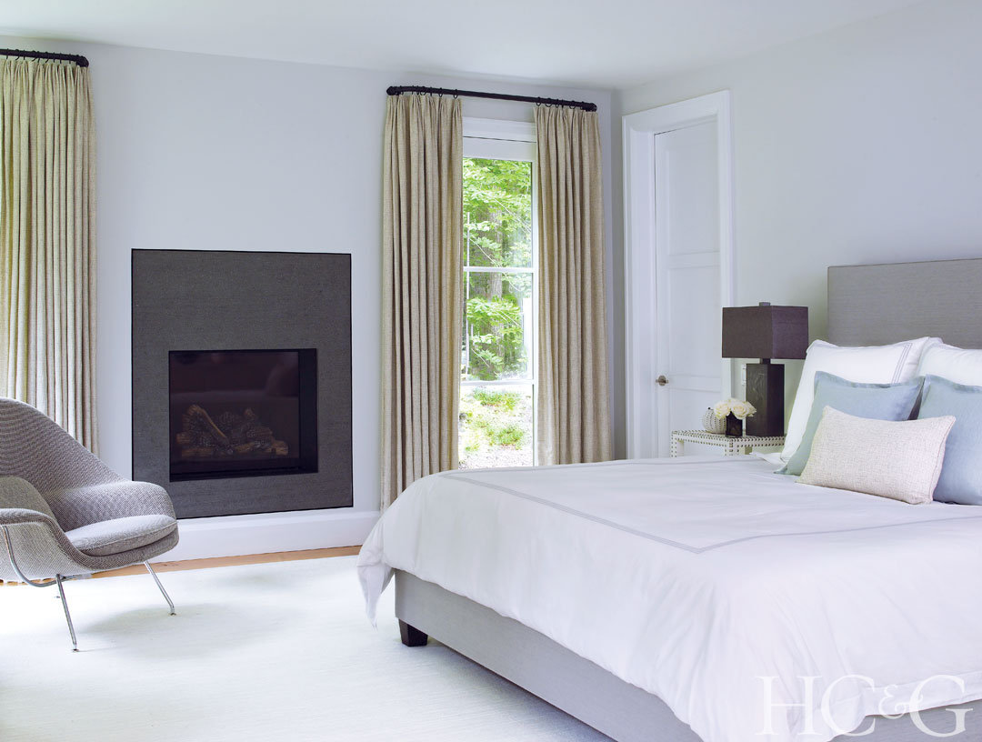 The master bedroom features a Womb chair from Design Within Reach, a Matouk duvet, and drapes made from a Kerry Joyce Textiles fabric.