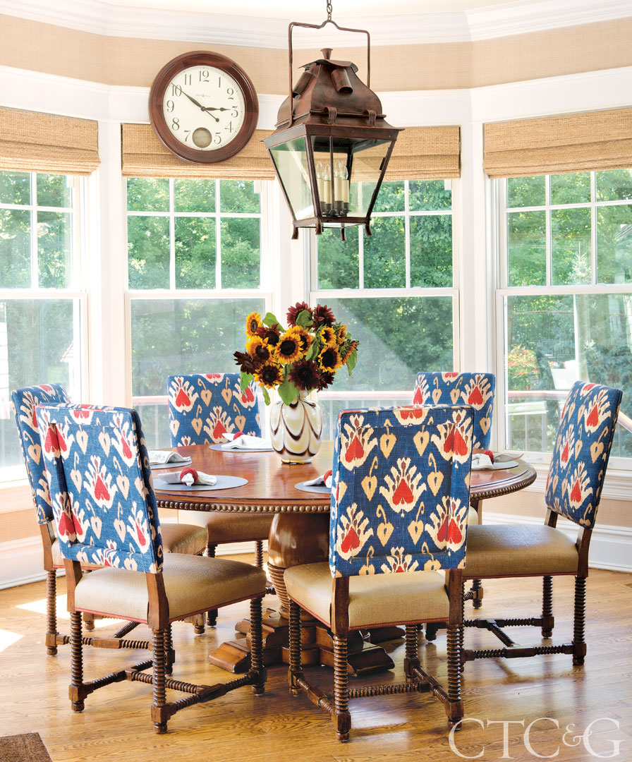 The Woodland Furniture breakfast table is surrounded by chairs from Bausman & Company upholstered in Andrew Martin fabric (backs) and John Hutton woven rush (seats) with Samuel & Sons trim. The lantern above the table is from Ann Morris Antiques.