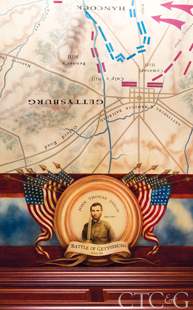 The ceiling features a scene by Anne Harris Painting of the Gettysburg battlefield, where the homeowner’s ancestor fought (and survived).