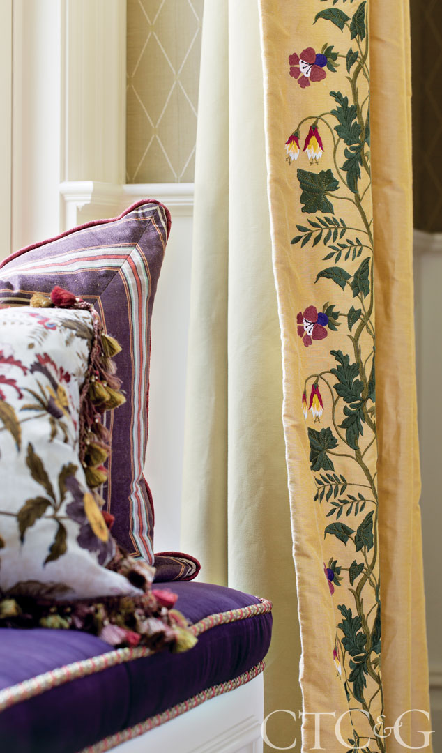 In the living room, custom embroidery by Penn & Fletcher is the finishing touch on the leading edge of curtains made of a Bengal House silk lined with Fabricut cotton.
