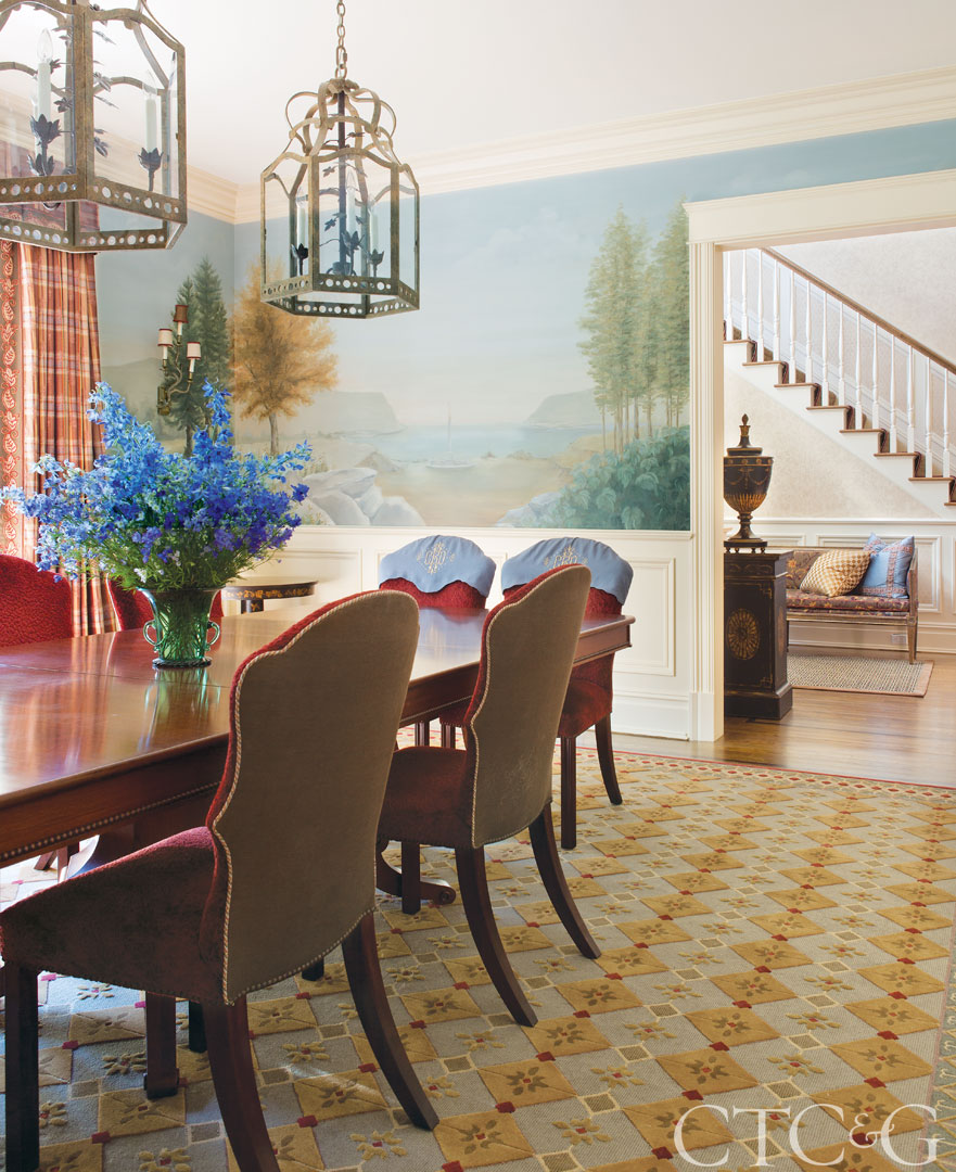 Interior designer John Eason helped commission Christianson Lee Studios to create a dining-room mural of the campus of West Point (the homeowner’s alma mater). The silver tea service is from Aire del Sur; demilune console table is from Scott Thomas Furniture.