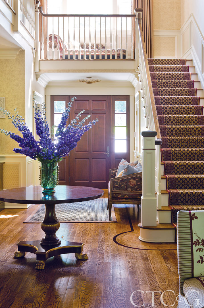 The entry is furnished with an Empire-style pedestal table from William Switzer and a love seat covered in Stroheim & Romann fabric. The carpet runner is from Stark; vintage glass vase is from Culture Object.