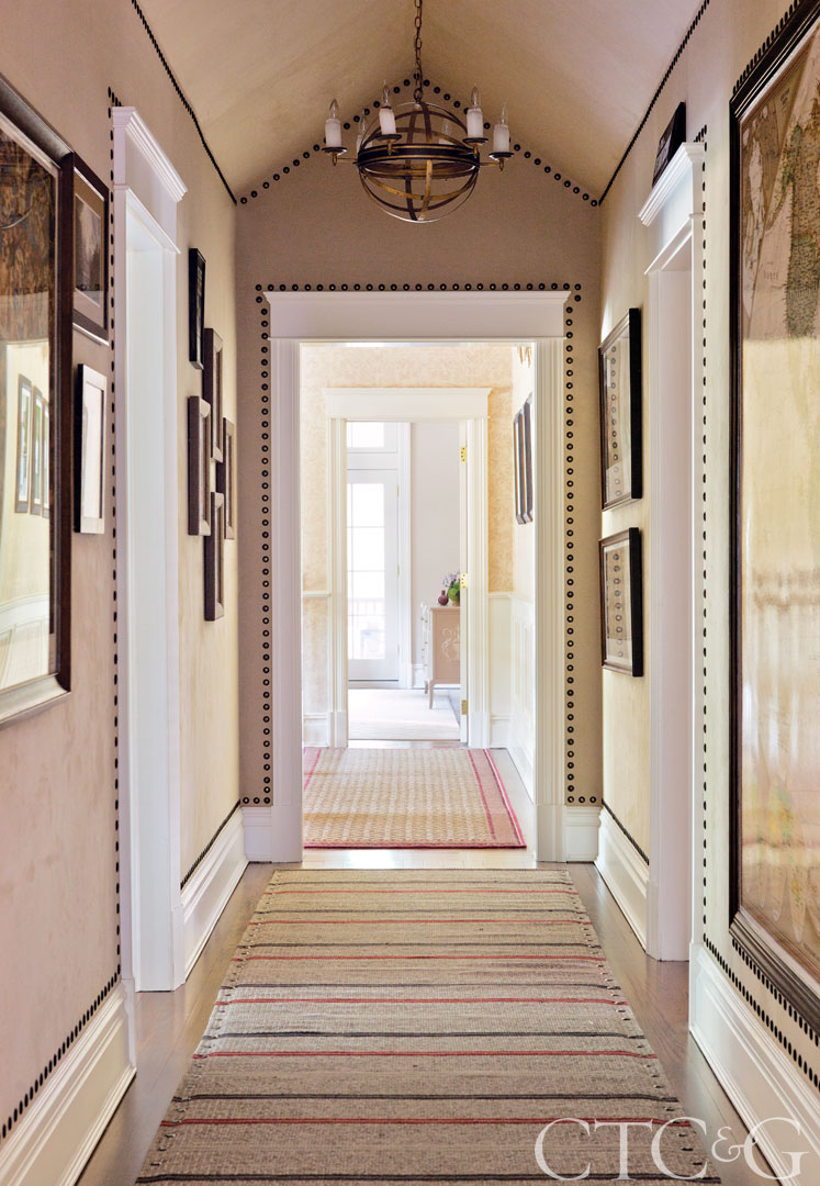 Leading to the master suite, Designtex suede wall covering lines the hallway and upholstery tacks add an unexpected detail. The chandelier is from Niermann-Weeks; the striped rug is by Elizabeth Eakins.