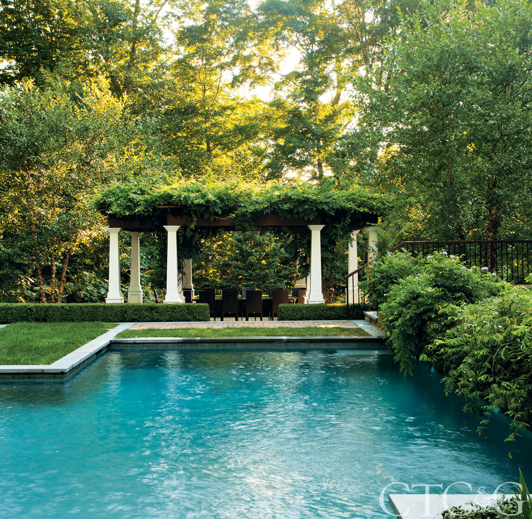 The house is complemented by landscaping, a pool area and a vine-topped pergola by Glen Gate.
