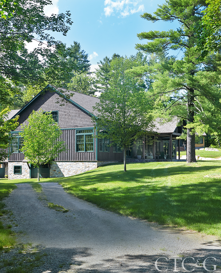 To create the main lodge, a second floor that houses bedrooms, gym, sauna and media room was added to the camp’s former mess hall.