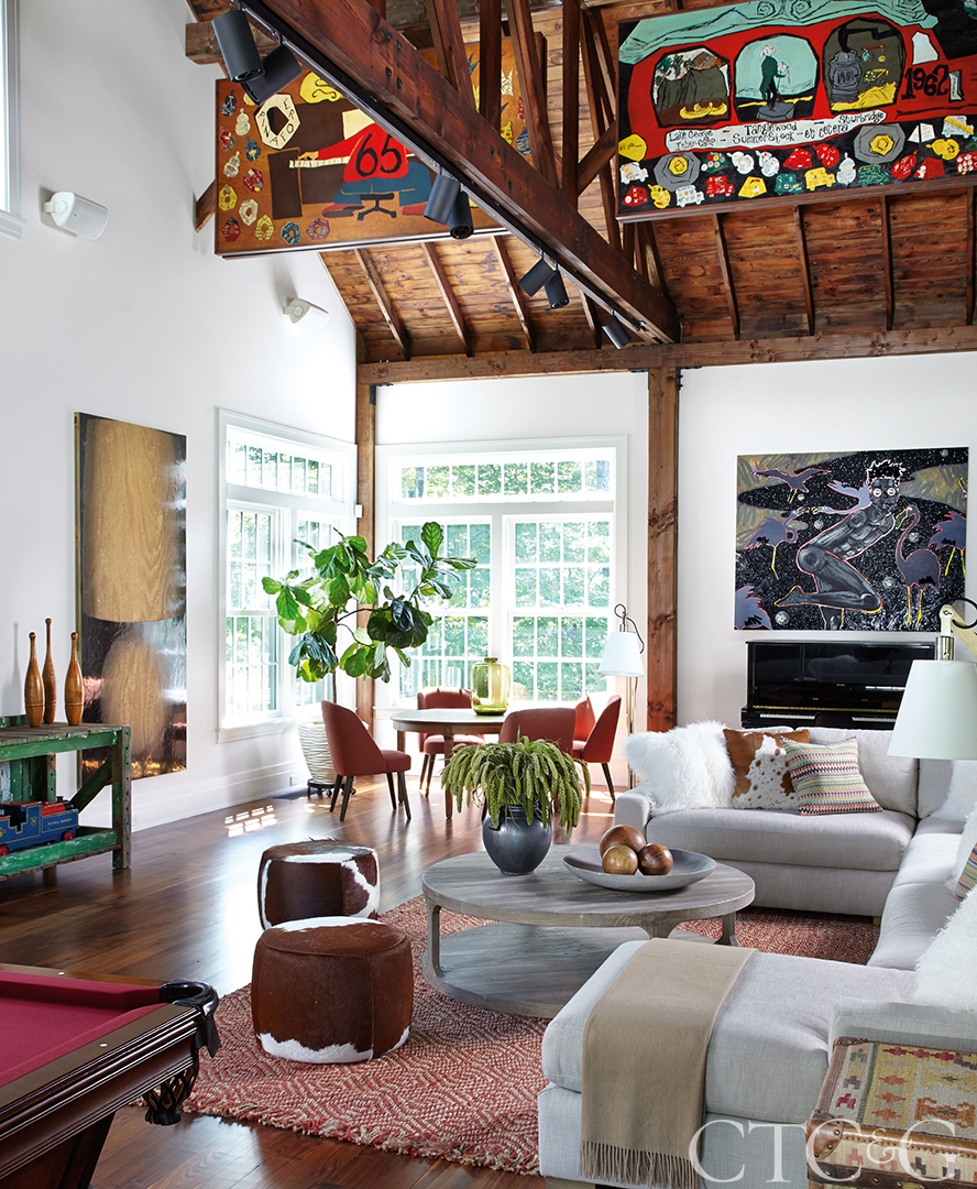 Banners from the camp’s early days—going back to 1952—were restored and hung in the lodge family room’s rough hewn rafters. An RH sectional and Room & Board cowhide poufs flank a circular coffee table. The Dash & Albert rug is through Annie Selke; the green painted buffet is from Mecox. Artwork above the piano by Devan Shimoyama is titled Every Lover in the Form of Stars (Tears of the Flamingo Prince).