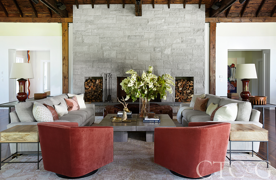 A pair of RH sofas face off across a grouping of CB2 coffee tables in the main lodge living room. Swivel chairs in a rust velvet are from Mitchell Gold + Bob Williams; side tables are from West Elm.
