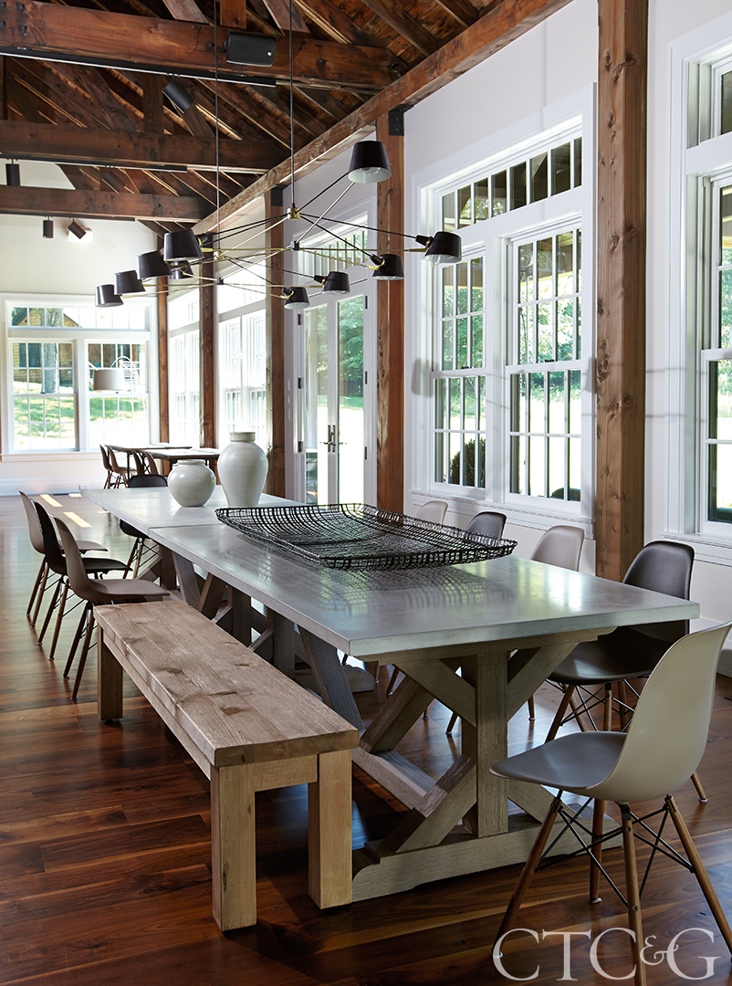 In the dining room, a bench from RH and Eames chairs from Design Within Reach surround a pair of RH dining tables under Brendan Ravenhill light fixtures.