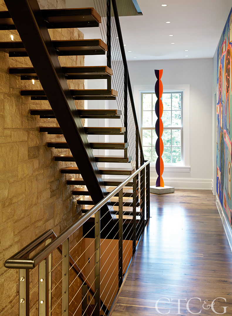 Kusine (Orange/Navy), a sculpture by Nicole Wermers, complements a custom iron stair and rail by Rolando Kraeher.