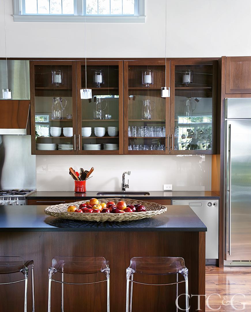 Kitchen cabinetry is designed and fabricated by Plato Woodwork. Counter stools are from Room & Board.