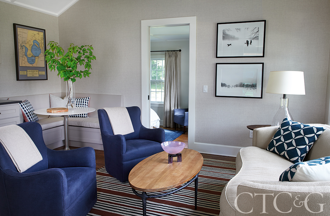 In the blue cottage, swivel armchairs from Lee Industries are complemented by a Pottery Barn rug and a wood and cast-metal coffee table from West Elm.
