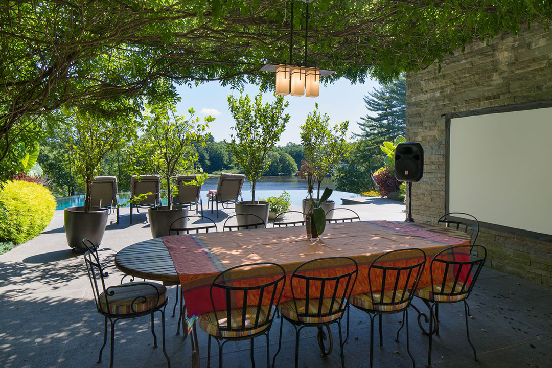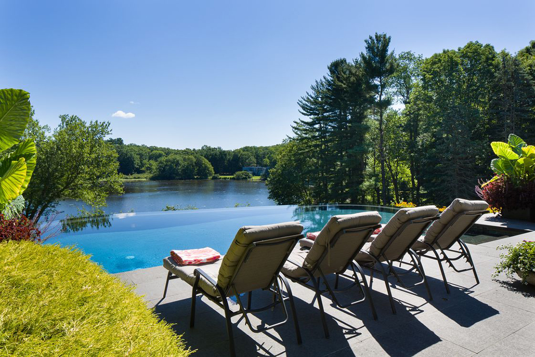 Though the town of Bedford, New York is more known for its classic colonial homes, and a downtown area to match, tucked away in the peaceful hamlet are some contemporary marvels. This first-class house located at 134 Pine Brook Road is one example. Designed by the NY-Berlin based firm 1100 Architect, the ultra sleek structure overlooks scenic Swallow Lake. Originally asking $6.75 million, a recent reduction has brought its price tag down to $5.995 million.The astounding abode blends in seamlessly with its natural surroundings thanks to an exterior that features imported granite and understated limestone. Glass walls integrate the home with the landscape, offering unparalleled views and light-filled interiors. The entry continues this theme, with glass and steel movable panels blurring the line entirely between inside and out.Included in the 5,784-square-foot living space are four bedrooms, one of which sits on the lower level, and six bathrooms. Downstairs, you will also find a three-exposure living room, with walls of glass surrounding a centered fireplace, and a minimalist kitchen with sleek white cabinetry that opens onto a tranquil terrace.Upstairs, the master suite exudes luxurious tranquility with dual dressing rooms and a spa-like bathroom with a soaking tub. The remaining two bedrooms overlook the heavenly grounds, which also include an idyllic infinity pool, sprawling orchards, original boathouse, and private dock.David Turner of Houlihan Lawrence has the lovely lakefront listing.