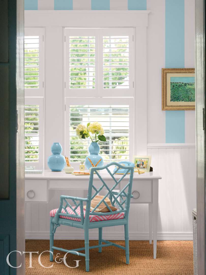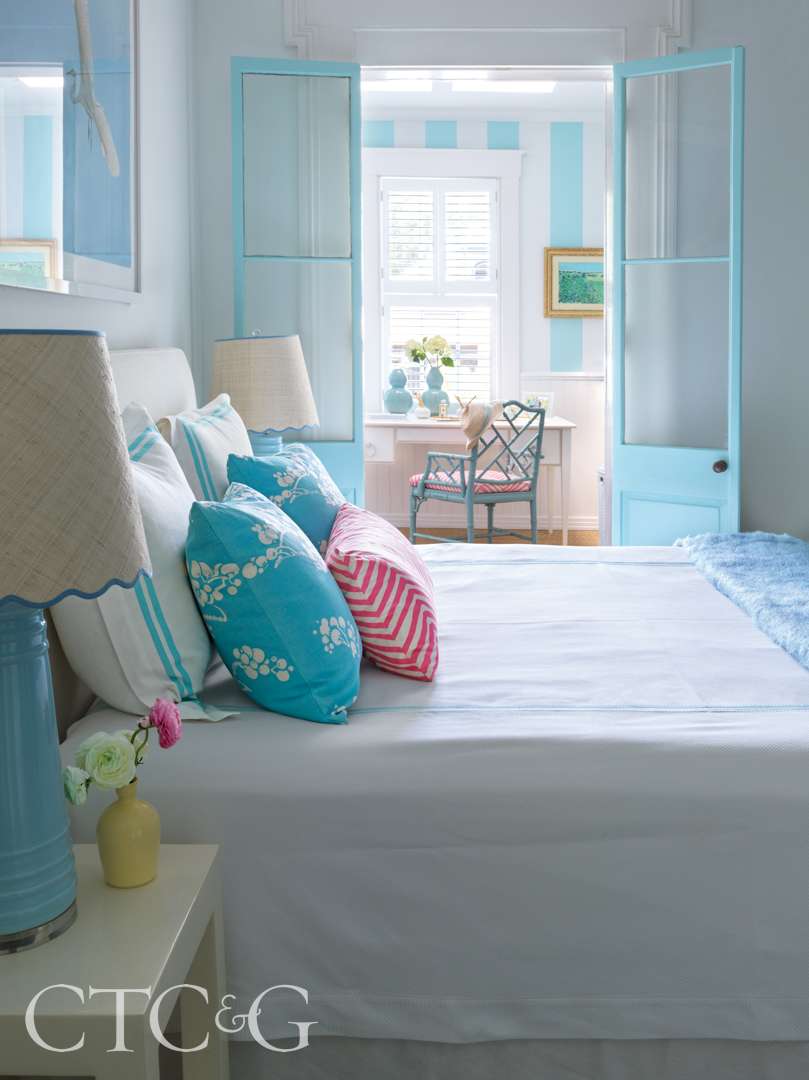 Morgan’s characteristic cheer continues in the primary bedroom, where pillows in Quadrille prints sit with blue-glazed porcelain lamps. Antique French doors painted blue open to a dressing room where the walls are painted in cabana stripes. “I like little surprises,” says Morgan.