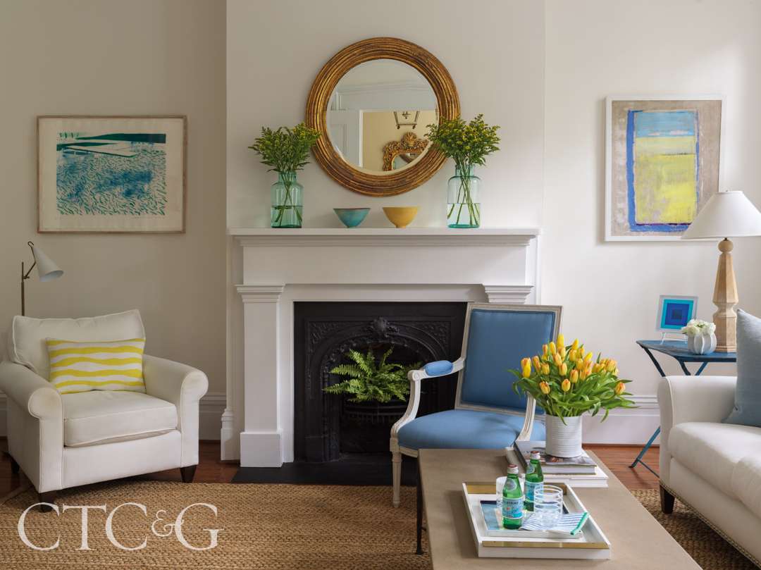 The original kitchen was pink Formica. Morgan painted it white and added wooden countertops. Decorative painter Shelly Denning painted the floors in a large-scale blue and white pattern. In the dining room, classical elements are balanced with zippy colors and modern art. The table was made by the Old Mill Road Company, and the chairs are covered in a chartreuse fabric that matches the shades on the antique chandelier. More apple matting covers the floor, while an antique mirror hangs over the mantel. In typical Morgan fashion, the room is sophisticated but welcoming and warm. “It’s easy elegance,” adds the designer.