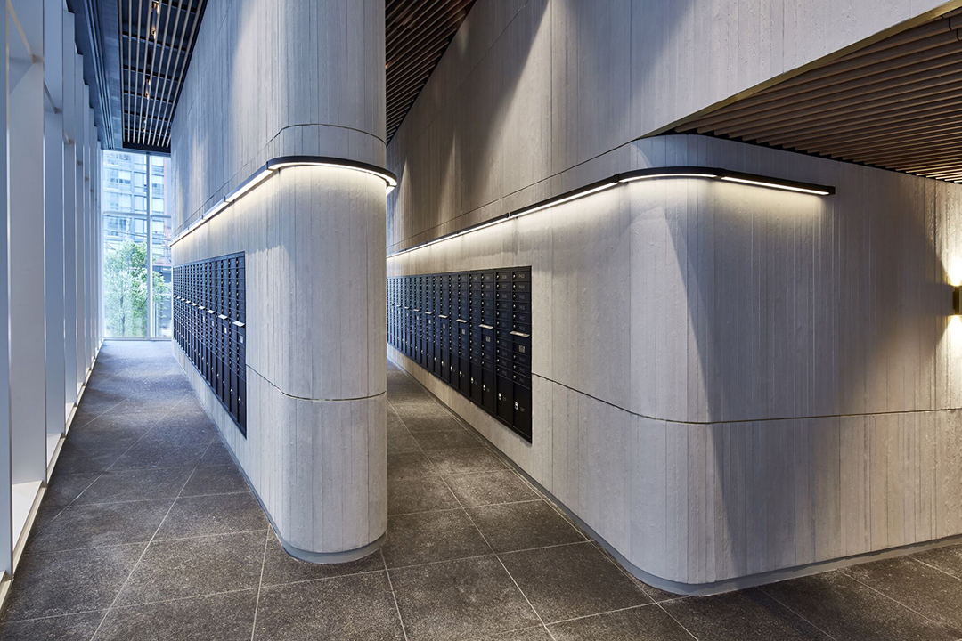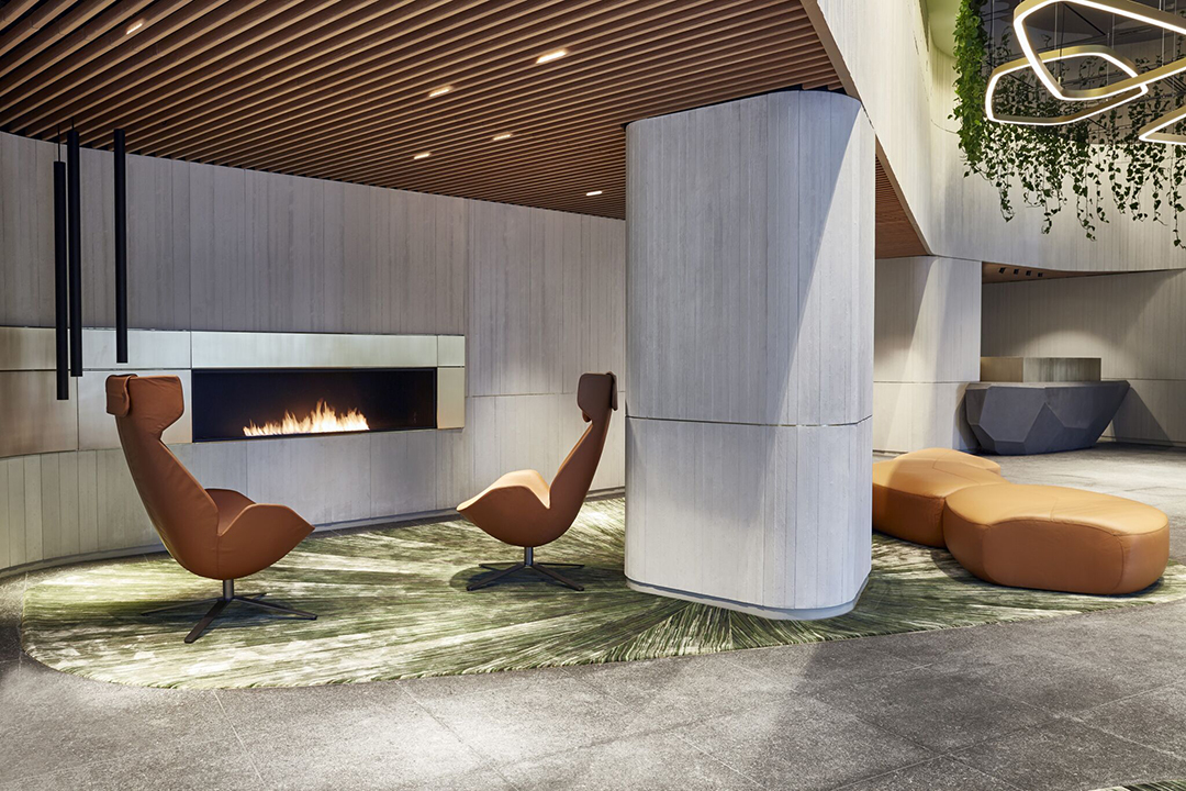The beautifully designed interior space also illustrates the developers’ commitment to creating something that is both design driven and totally unique. The owner tapped famed Parisian interior architect Noé Duchaufour-Lawrance and internationally-renowned landscape designer Bas Smets to create an oasis of calm set apart from the bustle of the city. Their embrace of nature, color and shapes can be found in the building’s intimate-but-grand lobby attended by a 24-hour doorman and full-time porters, soaring two-story communal lounge with a lush green winter garden, and expansive communal workspace, all featuring leafy green plantings that run wild throughout the spaces.
