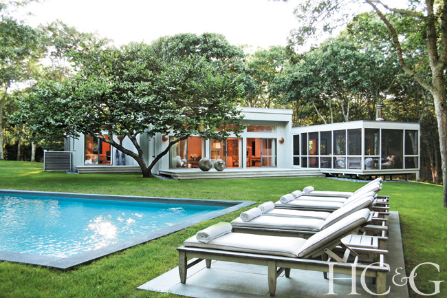 On the screened porch, a sofa and pair of chairs from Kingsley- Bate are covered in a Sunbrella fabric; the cashmere throw is by Loro Piana. The suspended stainless-steel fireplace is from Fireorb.