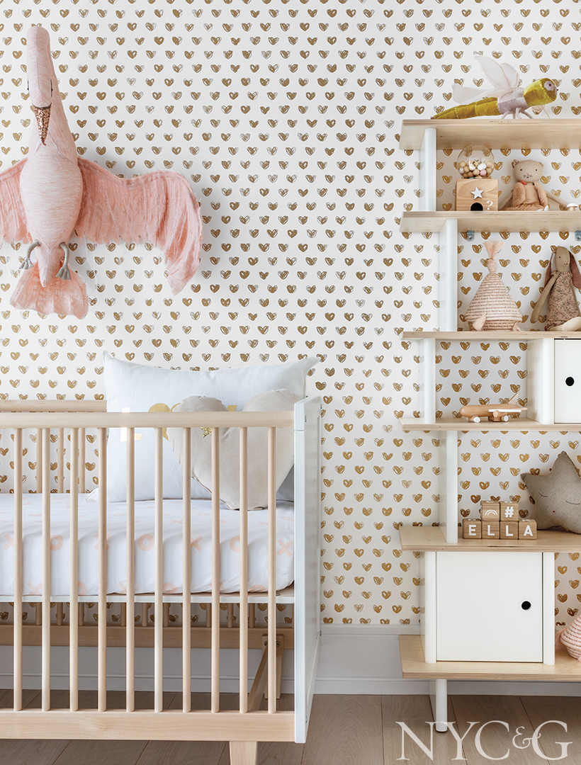 Fortuitously, the apartment’s sharply delineated floor plan includes separate “wings”—a master suite on one side and three children’s rooms on the other, plus a fourth that’s used as a playroom—that are ideally suited to the needs of a growing family. The latter is outfitted with custom kids’ furniture from Sissy+Marley’s line with Ducduc, while the bedrooms incorporate smart storage solutions, such as built-in floating shelves in baby Ella’s room. And so as not to take things too seriously, Sissy+Marley’s whimsical collaborations with wallpaper designer Jill Malek are in evidence on the walls. “These prints serve as art, transforming the spaces with pattern, texture, and color, while also keeping the mood playful,” says Rice, deftly summing up the Sissy+Marley way.