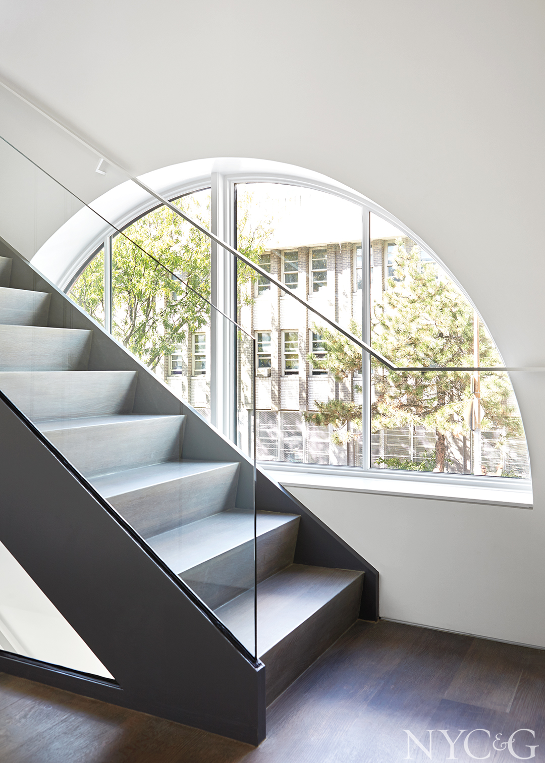 The white is a nontoxic Benjamin Moore paint pragmatically chosen for easy cleaning. Floors are fumed-oak planks, except in the basement, where matching faux-bois porcelain tiles have been installed in the event of flooding. The home’s bravura architectural statement: a floating staircase with steel stringers and a plate-glass balustrade. Zipping in front of the main arched window, it offers arriving visitors a glimpse of the unbridled modernism within.