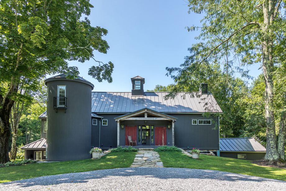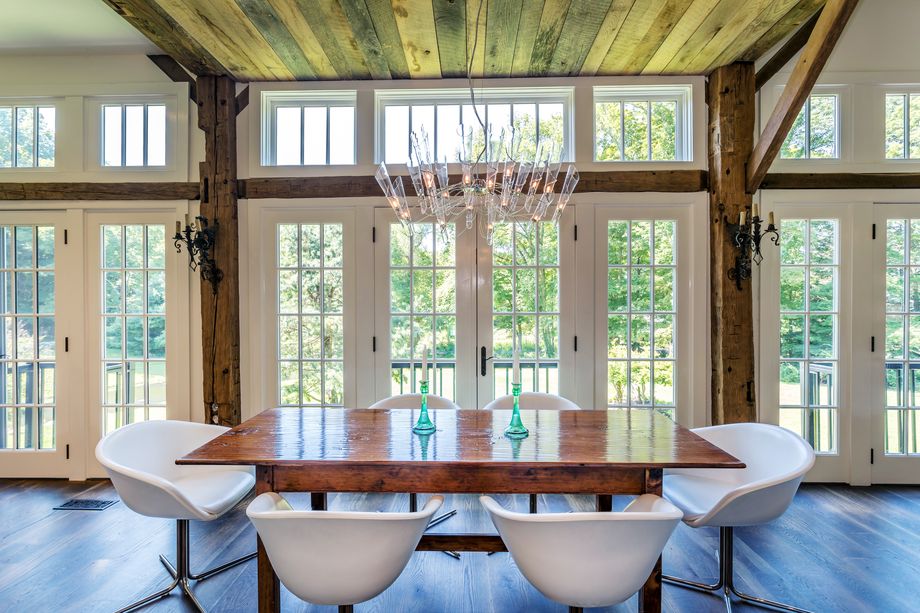 The home’s designers clearly had a lot of fun with the floor plan, placing the master suite, complete with a large sitting area and walk-in closets, in the restored silo. Below, the main level is wide open, with the kitchen looking over the living and dining rooms, which are serviced by a towering stone fireplace. The barn itself is surrounded by 3.6 acres of sprawling lawn, home to a front porch, stone-lined gunite pool, landscaped pond, pergola, and an orchard.
