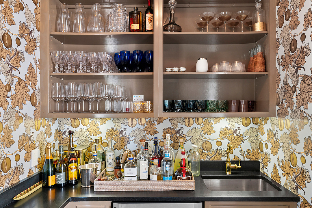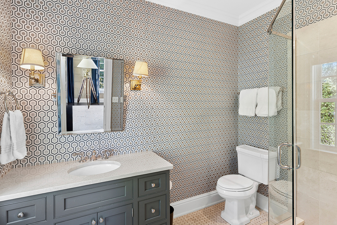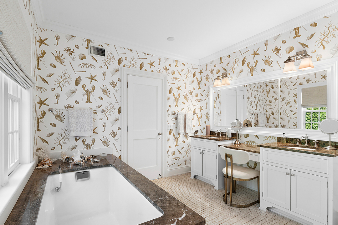 Boasting interiors by Atlanta-based designer Helen Davis, the decor leans coastal, traditional, and playful. Dimensional coral elements on the walls add texture to the stairways, while whimsical crustacean wallpaper enlivens the primary bathroom. Shell chandeliers and shades of blue alongside the white interiors further harken the home’s breezy seaside character. Davis also brought in tons of patterns, making the bathrooms and wet bar especially exuberant. Meanwhile, the neutral-toned living room and glossy blue office maintain a more subdued, sophisticated touch.