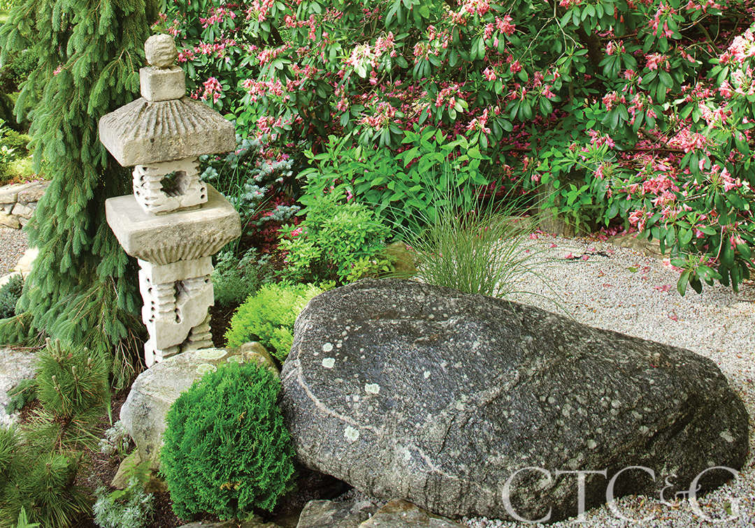 Stones were selected in keeping with the poetic wabi-sabiworldview of finding beauty in nature’s irregularity and in the patina of age; conifer plantings retain shades of green for winter beauty.