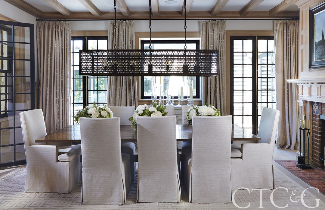 In the dining room, a Gregorius Pineo hanging lantern, table and chairs create an inviting vignette atop a geometric wool rug through HB Home. Drapery fabric is through Zimmer + Rohde.