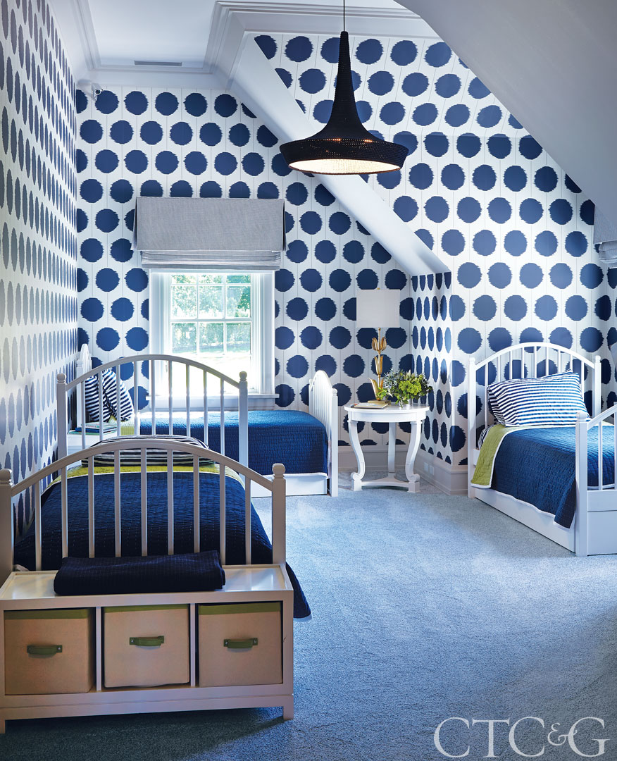 A Naomi Paul pendant in navy and Scion wallpaper through Zoffany inspire delight in a kids bedroom. Roman shade is crafted from Kravet blue and white houndstooth fabric.