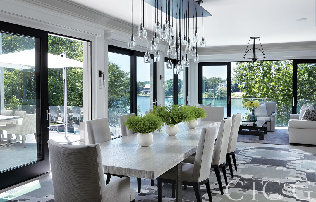 Expansive views and an Alison Berger Glassworks chandelier dominate the great room, where a Gregorius Pineo table is paired with A. Rudin chairs in a Great Plains fabric from Holly Hunt.